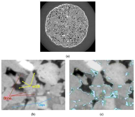 For the two-phase flow experiments, we used 0.1 M of potassium iodide (KI) in water as a contrast agent. The concentration of 0.1 M KI in the water forms a brine with intermediate XR attenuation values between the scCO2 and the quartz and therefore provides the ideal gray-level contrast required to separate the different phases. The single-phase and two-phase flow experiments were performed on Beamline 8.3.2 at the Advanced Light Source (ALS) at the Lawrence Berkeley National Laboratory. The entire set-up and methodology were previously described by Voltolini et al. [19]. For the two-phase flow of scCO2, the images were collected on the core plug, and experiments were successively performed on the same sample in the same position. The complete dataset is a stack of 853 slices of 2650 × 2414 with a voxel size of 4.4 μm. Images were cropped to 800 × 800 × 800 voxels and were processed using a fully assembled computer with a 12-core Intel® Core™ i7-5820K CPU @ 3.30 GHz, with 32 Gigabytes of RAM and an NVIDIA GM204 GPU under Ubuntu 18.04.6.