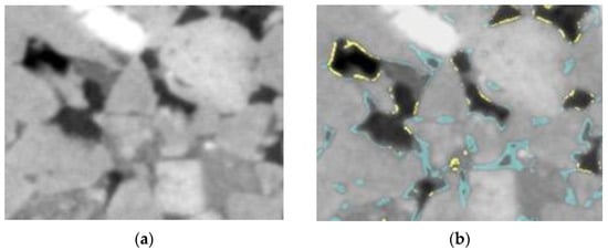 The mean and median filters associated with Otsu’s method displayed an error range of about 10% for porosity. However, the surface area, as well as the x-, y- and z-permeability properties ranged from 19,615 m−1 to 25,312 m−1 (a difference of about 20%) and from 4.86 × 10−12 m2 to 6.04 × 10−12 m2; 5.18 × 10−12 m2 to 6.27 × 10−12 m2 and 4.21 to 5.50 × 10−12 m2 (with a maximum difference of around 31%) compared to segmentation using Ilastik (Table 1). A cropped sample shows the differences (Figure 4) between the two. Despite some very similar macroscopic values, there are some substantial local differences in the case of edges and wedges.