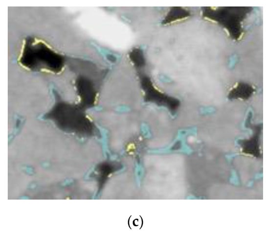 Influence of the segmentation performed with Ilastik vs. Otsu’s method: (a) raw reconstructed image, (b) description of a local zoom with an identification of phases, (c) local zoom with cyan voxels corresponding to voxels considered to represent porosity only using Ilastik (relative to Otsu’s thresholding), and yellow voxels corresponding to voxels considered to represent porosity only using Otsu’s thresholding (relative to Ilastik).