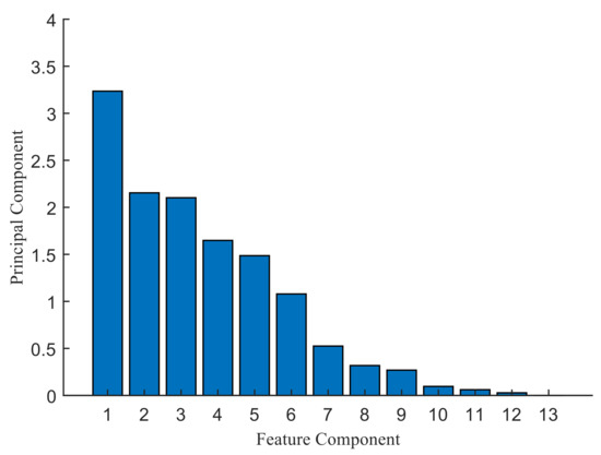 It can be seen that: the contributions of the components decrease in order; the first component has a much higher contribution than the others; the contribution values of components two and three are basically equal; and the first six components are the main components with a cumulative share of 90%. In most cases, feature component screening causes a decrease in prediction performance [46], so all feature components are retained.