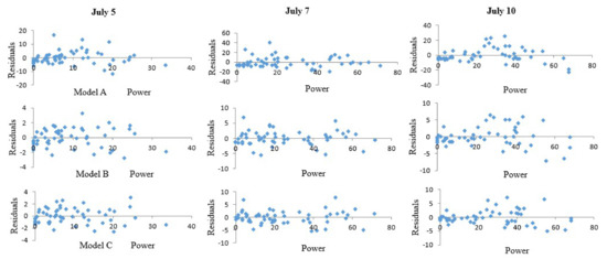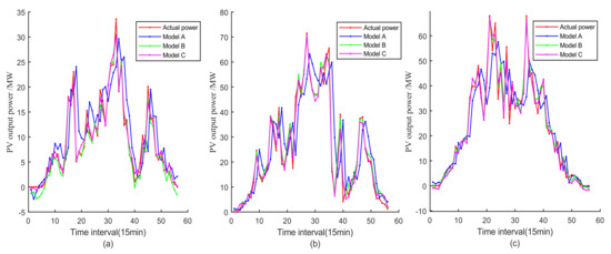 To test the applicability of the model for prediction under complex weather conditions, three days with large fluctuations are selected from the dataset for output prediction, as shown in Figure 6. Since the prediction performances of the multivariate models in the above experiments are all better than those of the univariate models, multivariate models are used for these experiments. In the above experiments, the prediction accuracy of the XGBoost model is not as good as that of the LSTM model. Therefore, the XGBoost algorithm will be abandoned in the following experiments, and the SSA-LSTM model characterized by meteorological data will be used as a replacement to verify the role of the newly constructed power features. The models are classified into three categories: A, B and C. Among them, model A is the LSTM model using only meteorological data as its features. Model B is the SSA-LSTM model, which also uses only meteorological data as its features. Model C is an SSA-LSTM model with meteorological features and the new power features as its features, and the experimental results are as follows.