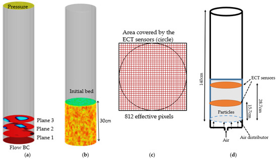 (a) Flux planes along the vertical height and boundary conditions; (b) initial bed height in CPFD model; (c) area covered by the ECT sensors; (d) schematic diagram of the experimental setup.