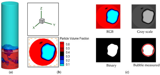 Post-processing of the three-dimensional simulation data is significant for the analysis of the bed fluid dynamics behavior. In this work, MATLAB and Tecplot were used for data analysis and visualization. Barracuda VR 20.1 comes with a 3D data visualization and data extraction software Tecplot 360 EX (CPFD software Barracuda VR, Houston, TX, USA). The hydrodynamics of the bed was determined by measuring the bubble properties (bubble diameter, bubble rise velocity, and bubble frequency). In order to calculate the bubble properties, the first step was to identify the bubbles at different positions. The bubble position was defined by the region where the solid volume fraction reaches zero. Based on a threshold value of the solid–gas fraction of 0–0.2, the bubbles in the bed were distinguished from the emulsion phase. In this work, a threshold value of ≤0.2 (solid volume fraction) was used to characterize the bubble region. The solid volume fraction of 0.2 is selected based on the suggestion made in previous studies [10]. To confirm the applicability of such a gas–solid threshold in this study, careful observation of the boundary region was carried out by checking the solid volume fraction of cells in the boundary region between the bubble and emulsion phase (as shown in Figure 3b). The bubble and its properties were determined from the images extracted from 2D horizontal and vertical planes.
