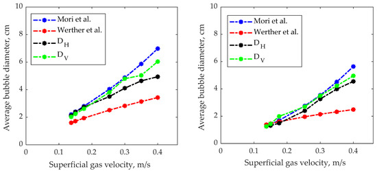 Average bubble diameter for different superficial gas velocities at height 10 cm (left side) and 5 cm (right side) [38,39].
