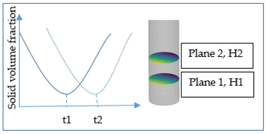 The bubble rise velocity was estimated by using a detailed signal analysis method and a bubble displacement method. The bubble rise velocity from the detailed signal analysis method was obtained from the fluctuation of solid volume fraction from two planes at heights of 10 cm and 5 cm for each bubble passage. As the bubbles rise from plane 2 to plane 1, there is a time lag () between each bubble passage, as shown in Figure 7. The bubble rise velocity () is obtained based on the distance between two planes (), as shown in Equation (4).