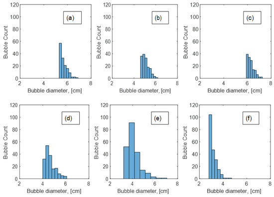 Bubble count vs. bubble diameter at superficial gas velocities of 0.4 m/s, 0.35 m/s, 0.3 m/s, 0.25 m/s, 0.176 m/s, and 0.15 m/s illustrated in the pictures from (a–f), respectively.