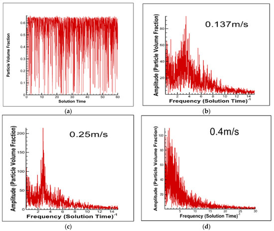 Figure showing: (a) fluctuation of particle volume fraction with time; (b–d) Fourier transform of the particle volume fraction for superficial gas velocities 0.137 m/s, 0.25 m/s, and 0.4 m/s, respectively.