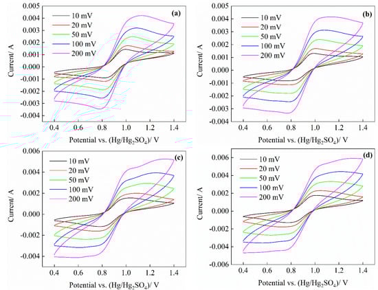 The CV cycle test and steady-state polarization curve test of the electrolyte were performed using a CHI 760B electrochemical workstation (Shanghai Chenhua Instrument, Shanghai, China). We recorded the current versus potential curves using a three-electrode electrochemical cell in the CV cycling test with a scan rate range of 10–200 mV s−1 in a potential range of −0.6–1.8 V at 25 °C, in which the graphite electrode (surface area of 3.14 mm2), saturated calomel electrode, and platinum electrode (surface area of 1 cm2) are the working electrode, reference electrode, and counter electrode, respectively. The steady-state polarization curve was tested with a potential range of 0.49–0.56 V and a scan rate of 1 mV s−1, because the current and voltage are closer to a straight line under the condition of lower potential. Electrochemical impedance spectroscopy (EIS) was also obtained at room temperature with the sinusoidal excitation voltage of the electrolyte of 5 mV and the frequency range between 0.01 Hz and 100 kHz. Prior to each electrochemical measurement, the working electrode was polished with SiC paper and then washed with distilled water. The reference electrode was washed with distilled water and the solution in salt bridge was replaced before use. Platinum plate electrode is cleaned with distilled water and ultrasonically treated.