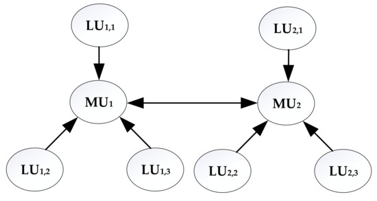 Similar to the multi-population genetic algorithm [27], the multi-universe parallel quantum genetic algorithm also has the problem that it is difficult to select the information exchange rate between populations. When too much information is exchanged, it reduces the diversity of individuals within various populations, loses the parallel algorithm’s feature of searching in multiple directions simultaneously, and reduces the algorithm’s global superiority-seeking ability. When too little information is exchanged in the populations, it again leads to ineffective propagation of outstanding individuals and reduces the convergence speed of the algorithm [28]. For this reason, this paper improves the multi-universe parallel topology of the multi-universe parallel quantum genetic algorithm by dividing the universes into main universes and minor universes. The small universes can only be attached to a specific main universe, and the information can only be transmitted in the direction from the small universe to the main universe it is attached to, or between different main universes. In this way, on the one hand, the individual diversity and independent evolution characteristics of the small universe are maintained, and at the same time, the independent characteristics of the small universe can also be transmitted to the main universe attached to it, maintaining a certain difference between the main universes, and ensuring the breadth of the algorithm’s search space; on the other hand, by adopting the optimal migration strategy, the excellent individuals in the small universes can also be effectively propagated in the main universes, ensuring the convergence of the algorithm. The improved multi-universe parallel superstar row structure is shown in Figure 2. Since only the parallel topology structure is improved, it is equivalent to a special form of the original multi-universe parallel quantum genetic algorithm, and the global convergence of the algorithm remains unchanged [29].