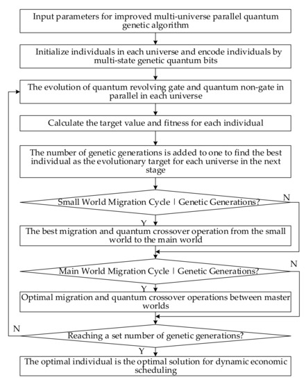 Taking the active base point and spinning reserve capacity setting of each conventional unit in each period as individual genes, the algorithm flow of solving the dynamic economic dispatch model based on the improved multi-universe parallel quantum genetic algorithm is shown in Figure 3. Among them, the multi-universe parallel topology structure is shown in Figure 2. The specific implementation of multi-state genetic quantum bit encoding, quantum rotating gate and non-gate evolution, and optimal migration and quantum crossover operation can be found in [29].