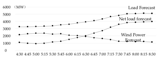 The constructed 10-unit system is used as an arithmetic example to verify the method of this paper. The characteristic data of each unit are shown in Table A1 in the Appendix A. The load and wind power forecast data are used from actual forecast data, publicly available for the Irish grid [30], as shown in Figure 4. The length of a single time period for dynamic economic dispatch is 15 min, and the number of forward-looking periods T is 16 (see reference [24] for the selecting the number of forward periods). The current share of wind power generation in the Irish grid is about 50–60% [30], and the total wind power generation in the example of this paper accounts for 43.9% of the total load power. The parameters in the model follow: z takes 2 [31]; and take 0.15 and 0.018 [31], respectively; IEAR takes 4 USD/S [16]; PCO2 takes 10 USD/t [32].