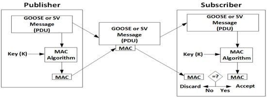 The principle of replay attack is to capture valid data during normal operation and re-use the recorded data frame again into a substation communication network for cyberattack. Although the replayed multicast data packets may come from the attacker, the recorded data frame could be regarded as legitimate communication. This attack will lead the subscribers to process the replayed old command and may result in an abnormal state of the substation system. In order to detect and prevent such an attack, Hash Message Authentication Code (HMAC) and GMAC have been proposed for multicast communications (e.g., GOOSE and SV) in digital substations [7]. However, encode and decode MAC will delay the end-to-end communication time; the performance test needs to be performed before applying the authentication method to the target system. Due to the limited computational resources of an IED, the MAC-based authentication method is an early stage for the productization.
