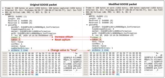 A GOOSE spoofing attack could be initiated by the man-in-the-middle attack. An original GOOSE message can be modified by adding malicious information. After analyzing the semantic information of GOOSE, the attackers may manipulate the binary information that can control the circuit breaker. By increasing stNum and changing sqNum to zero, the subscriber IED (e.g., circuit breaker) may mislead the operation.