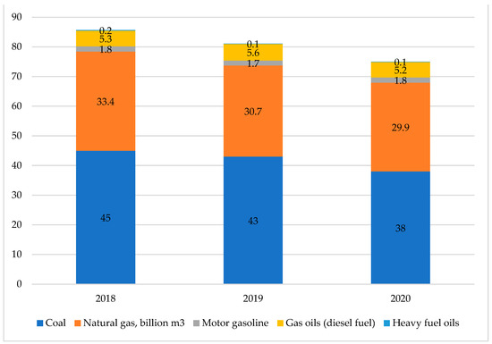 As for Ukraine, in terms of the statistical data “Ukraine in numbers 2020” is shown in Figure 1. We tracked the positive dynamics of the decrease in the use of natural fossil energy sources as fuel for production, operational and domestic needs. In Figure 2 and Figure 3, in 2019 in Ukraine, we tracked the correlation between a supply decrease of electricity, gas, steam and conditioned air and a decrease in the impact of these substances on air pollution. In general, in Ukraine and other countries in 2020, a trend to revive economic activity and increase energy consumption was observed [36,37,38].