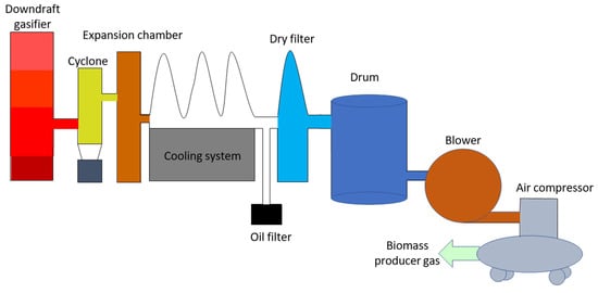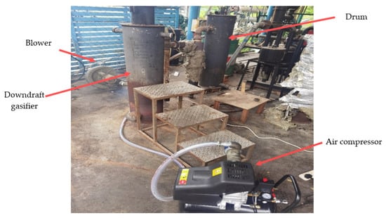 Figure 2 and Figure 3 show the gasification apparatus used in this experiment. Gravity controlled the descent of the biomass through the gasifier’s drying, pyrolysis, partial oxidation, and reduction zones. The gas was collected at the gasifier’s bottom during the process. When the gasifier’s emissions reached the cyclone, fly ash was created in the product gas. During the experiment process, the gasification was set to operate at a peak temperature of around 700 °C. In addition, gas chromatography was used to evaluate the BPGs collected after the gasification system’s filter to determine the syngas concentration (H2, O2, N2, CO, CH4, and CO2).
