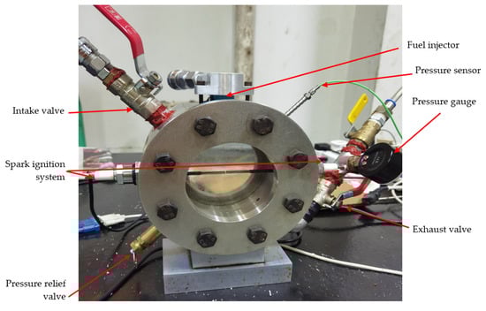 The experimental setup for BPG formation and measurement of combustion characteristics using the CVCC is shown in Figure 4. The CVCC’s main body was fabricated from stainless steel and had an inner diameter of 118 mm, an outside diameter of 165 mm, and a thickness of 80 mm. A strata gas injector, pressure relief valve, and intake/exhaust ball valves were all included in the CVCC system. In the CVCC system, two spark ignition probes were each assembled on the left and right of the chamber. The air gap (0.05 mm) between both spark ignition probes allowed an electric spark to pass between the conductors. To avoid an excessive pressure buildup inside the CVCC, a pressure relief valve was installed. In addition, a Kistler 6053B60 pressure sensor was employed to measure chamber pressure traces during the combustion process.