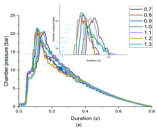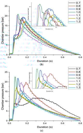 Figure 6a–c demonstrate that the chamber pressure increased as the mixture approached the rich limits and decreased as it approaches the stoichiometric limit. The chamber pressure would drop if the ϕ was lean, which represented surplus air compared to a ϕ equal to 1. The chamber peak pressure of 21.55 bar was reached when the ϕ was stoichiometric (ϕ = 1). Figure 6a depicts the peak pressure at a ϕ of 0.7 (approximately 20.24 bar). The chamber peak pressure was the lowest at 19.02 bar when the ϕ was 1.3. Lean conditions differed from stoichiometric conditions by about 6.07% while rich conditions differed by about 11.74%.