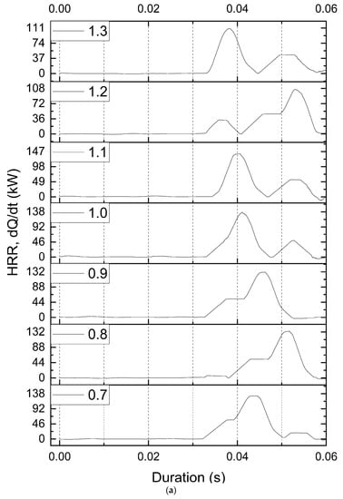 Figure 7a–c show the HRRs of different BPGs. Compared to when the ϕ was stoichiometric, the largest HRR was 140 kW when the ϕ was 1.1, but the time to achieve the HRR was the longest. The HRR at a ϕ equal to 1 was 133 kW compared to the highest HRR, which was a ϕ of 1.1, which differed by approximately 5.12%. Compared to lean and rich conditions, the premixed combustion phase produced the smallest narrow shape when the ϕ was stoichiometric. A flame with a high HRR will radiate more energy compared to one with a low HRR [29]. Figure 7a shows that for a ϕ of 0.7, 0.8, 0.9, 1.0, 1.1, 1.2, and 1.3, the times required to achieve premixed combustion of WP were 0.032, 0.038, 0.033, 0.033, 0.034, 0.033, and 0.033 s, respectively. Regarding the time to achieve an HRR of ϕ ranging from 0.7 to 1.3, a ϕ of 0.8 was the longest at around 0.038 ms.
