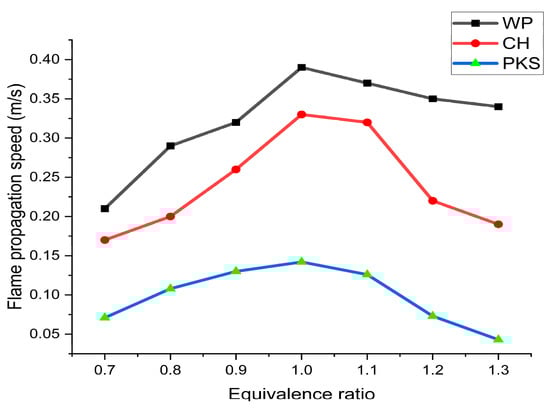 - As the mixture approached the rich limits, the flame propagation speed increased and then decreased as it approaches the stoichiometric limit. The flame propagation speed of the PKS was the slowest, only reaching about 0.142 m/s, whereas that of the CH was about 0.33 m/s. WP had the fastest flame propagation speed, reaching roughly 0.39 m/s when the ϕ was stoichiometric. The flame propagated fastest because the WP had the highest LHV (1 MJ/Nm3). The peak flame propagation for CH was approximately 15.38% quicker than the peak flame propagation for PKS and 63.58% faster than the peak flame propagation for WP. The higher concentration of hydrogen content of the BPG would increase the flame propagation speed.