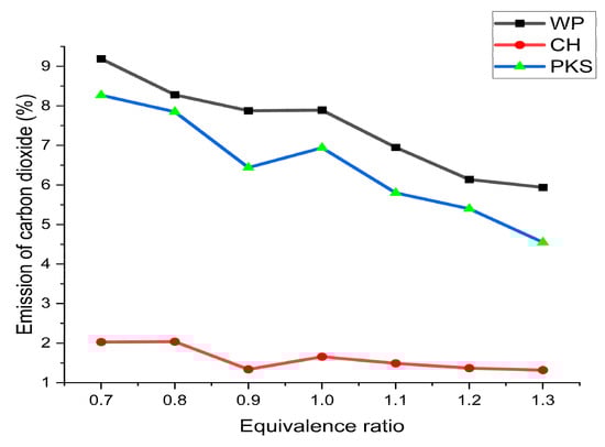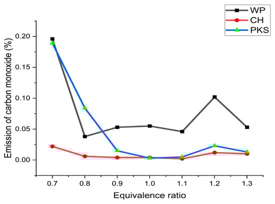 The CO2 and CO emission traces for the three BPG–air mixtures is shown in Figure 9 and Figure 10, in which they are contrasted at fixed initial pressures with a ϕ ranging from 0.7 to 1.3. The BPG–air mixtures decreased as expected until the stochiometric ϕ was equal to 1, then slightly increased after it reached 1, and then decreased linearly to the prosperous state. The complete burning resulted in more CO2 being produced when the ϕ was stoichiometric. At a ϕ of 0.7, the CO2 emissions for WP showed the maximum level of about 9.19% while the CO2 emissions for CH showed the lowest level at 2.03%. The ultimate analysis of the biomass feedstock will have an impact on CO2 emissions. Based on Table 3, the CO2 composition of WP was 3.42% and the CO2 composition of CH was around 2.93%. The CH4 composition of WP was 0.77% and the CH4 composition of CH was around 0.45%. The high carbon content of the biomass used as a producer gas will impact the CO2 emissions. The CO emissions of WP reached their peak of about 0.196% at a ϕ of 0.7 whereas the CO emissions for CH reached the lowest level of 0.022%. While a ϕ of 1.2 showed an increase in CO in the rich condition, the emissions of CO decreased from the lean condition to the rich condition. Due to air shortage and reactant concentration in rich combinations, all the carbon could not be converted to CO2 and instead formed a CO concentration. A tiny amount of CO was also released under lean conditions due to chemical kinetic effects even if the CO was created during operation in rich mixtures [30].