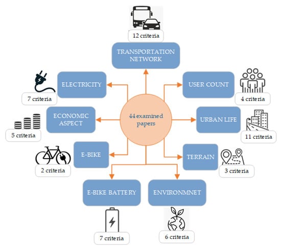 The authors examined 44 scientific articles on charging stations for many types of e-vehicles (e-cars, e-scooters, e-taxis, e-bikes), not just e-bikes, for two reasons: (1) the small amount of research in the field of e-bikes (only six articles were found) and (2) the similarity of the criteria with other e-vehicles. The operation and use of car-sharing systems are similar for all e-vehicles, with certain exceptions related to the size of the vehicles and batteries. Therefore, in this case, it is sustainable to use criteria that already exist in the literature and expand the list with specific criteria for e-bikes. All the papers found were published in peer-reviewed journals.