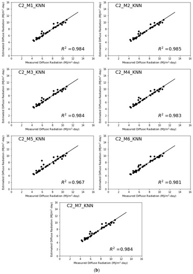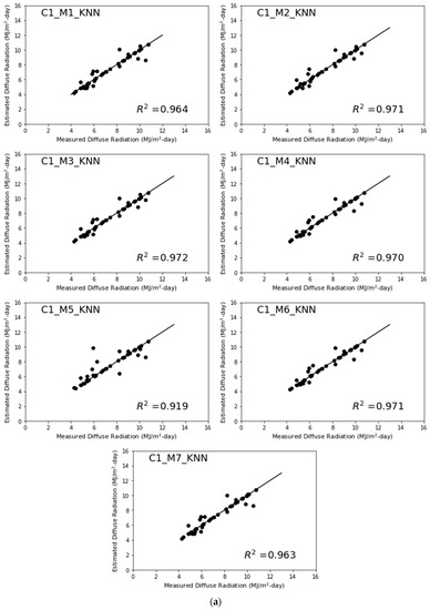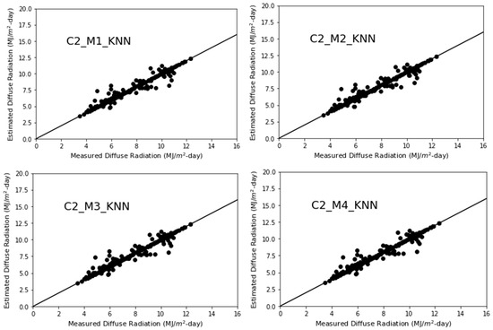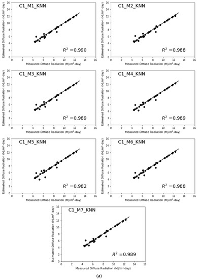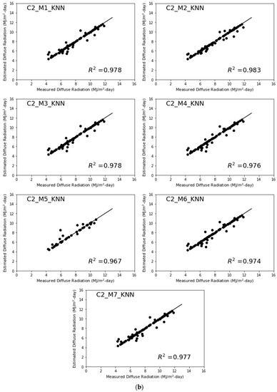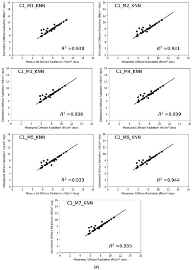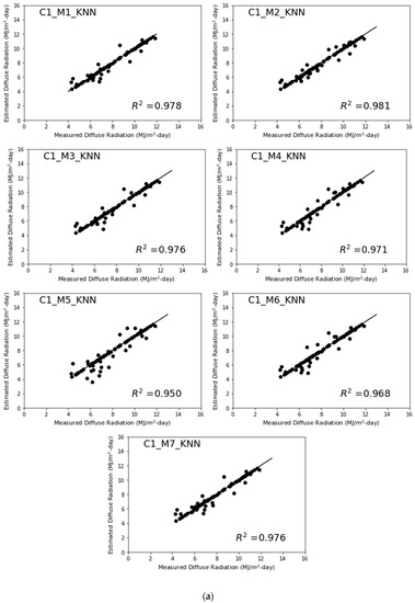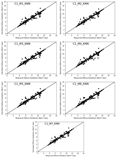 The ML models developed in both categories have been employed to predict DSR for five climatic zones of India. As the performance of KNN models is better in comparison to RF Models, we used KNN models for application. The scatter diagrams of the predicted and measured values of DSR are shown in Figure 8, Figure 9, Figure 10, Figure 11 and Figure 12.