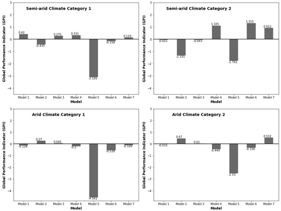 Figure 6 shows the GPI estimation of overall India consisting of different climatic zones. In category 1 KNN models, Model 2 ranked 1 (GPI = 1.393), followed by Model 7 (GPI = 0.682) and then Model 1. For category 1 RF models, Model 7 leads the 1st rank (GPI = 0.177), followed by Model 4 (0.099) and Model 3 (0.081). In category 2 KNN models, Model 2 is ranked 1st (GPI = 0.644), then Model 1 (GPI = 0.258) and then the rest of the models. In category 2 RF models, Model 3 is estimated 1st rank, followed by Model 4 and then Model 2.