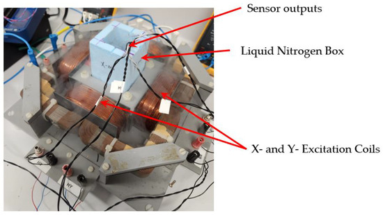 A square specimen tester, as presented by Brix et al. [30], is advantageous for detecting 2D power loss because of its flexible control mechanism, more uniform magnetic field, and greater precision than any other standard measurement device. In this study, a modified single-sheet SST [31,32] is used to investigate the rotating dissipative AC loss characteristics of the HTS bulk sample. The SST is comprised of yokes, which are composed of silicon steel sheets that are grain-oriented and vertically laminated. The tester features four wedge-shaped magnetic poles, thanks to the construction of the yokes’ forms. On the X-axis and Y-axis’ magnetic poles, two sets of excitation coils are linked in series to one another. Each coil has 300 turns of insulated copper wire that is 1.6 mm in diameter. A precisely fabricated liquid nitrogen box is installed in the middle of the taster to house the HTS sample that is submerged in liquid nitrogen. A square specimen of the material is positioned in the tester’s center. Figure 1 and Figure 2 depict the equivalent block diagram of the 2D experimental setup and the positioning of the liquid nitrogen box, respectively.