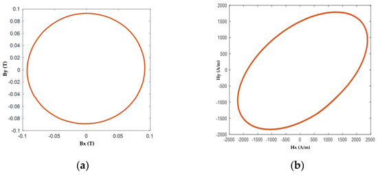 In this initial study, a purely circular rotating magnetic field was applied with various amplitudes, and the results can be obtained as described in Section 3.2. Figure 4 shows a sample of the controlled locus of B and the corresponding locus of H at the magnetic flux density of 90 mT at 50 Hz. It can be seen that the locus of H is not circular compared to the locus of B, as the permeability contrasts with B and H; besides, the maximum values of Hx and Hy are also not similar, as the material behaves differently, when magnetized in the x and y directions.