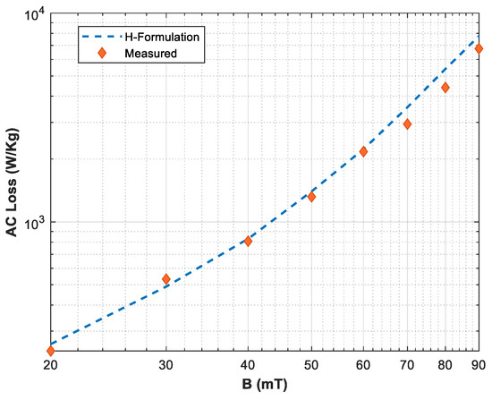 Furthermore, the loss variation is also shown in Figure 5, where the HTS sample is subjected to various rotating flux densities up to 90 mT. The loss is also compared with the numerical modeling methods described in [20,21,22,33,34]. H-formulation is a powerful tool based on the finite element modeling method. Readers may refer to the recently published investigations of the authors.