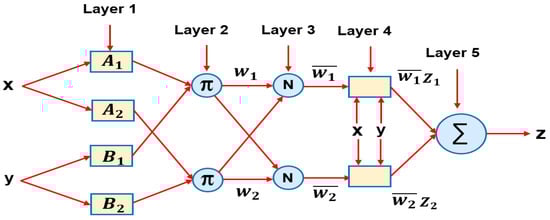 Adaptive Neuro-Fuzzy Inference System (ANFIS) was presented by Jang [] in 1993. It is a unique hybrid model which employs the paired features of neural networks and fuzzy logic in its design. In other words, being an adaptive hybrid multi-layer feedforward network ANFIS harnesses the duo learning capabilities of artificial neural networks (ANN) with fuzzy inference systems (FIS) to mimic the process through which humans make knowledgeable decisions []. The ANFIS modeling technique is derived from the Takagi–Sugeno fuzzy system, which consists of antecedents and consequences []. The five levels of the ANFIS architectural framework are the fuzzy, product, normalization, defuzzification, and summation layers, which are arranged from layer 1 to layer 5 [,]. ANFIS is a hybrid learning methodology that uses back-propagation gradient descent with least squares techniques for optimizing model parameters. The basic ANFIS model uses five layers and fuzzy IF-THEN rules to produce a nonlinear map between input and output, as illustrated in Figure 1. In the first layer, two inputs are received, x and y, and each node’s output is determined by the generalized Gaussian membership function (). These steps are depicted in Equations (1)–(3) [].