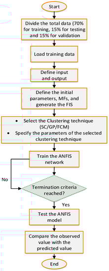 The clustering approach is critical to the ANFIS model’s viability and tractability []. The choice of clustering algorithms must be considered carefully since the type of clustering utilized for ANIFS has a significant influence on the model’s accuracy when approximating an output function []. Hence, the next session discusses the different types of clustering techniques used in this study. Figure 2 shows the flowchart of the proposed ANFIS model.