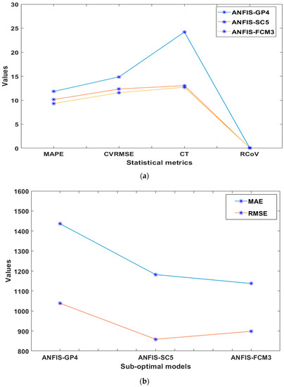 This session evaluates the performance of the optimal sub-models in the three previously stated scenarios. Table 7 displays the comparison of the three best sub-models obtained from earlier analysis. The comparison of the three sub-models is shown in Figure 5a,b. The graph between the actual and predicted electricity consumption for the three optimum sub-models is also shown in Figure 6, Figure 7 and Figure 8, along with the error graphs. Taking the testing phase into account, the results from Table 7 show that the three models provided good results in the prediction of electricity consumption; however, the ANFIS-FCM3, with five clusters, delivered the best model prediction accuracy of 90.7% compared to ANFIS-SC5 (CR = 0.40) with 89.9% and ANFIS-GP4 (dsigMF, constant) with 88.2%. ANFIS-FCM3 (with five clusters) again produced the smallest values for the RMSE (1137.6024) and CVRMSE (11.5727) when compared with the other sub-models. Nevertheless, as shown in Table 7 and Figure 5b, the ANFIS-SC5 (with CR = 0.40) surpassed the other two sub-optimal models in terms of the MAE. Additionally, the ANGIS-GP4 (with dsigMF, constant) demonstrated better results in terms of the RCoV statistical metrics. That said, the ANFIS-FCM3 (with five clusters), maintained its best performance for the CT with the smallest value of 12.6918 s (Figure 5a).