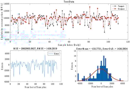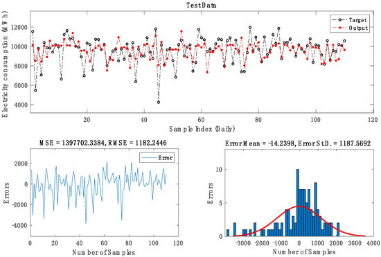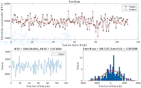 The proposed models utilized a dataset division of 70% for training and 30% for testing. Generally, developed models are often evaluated by applying statistical metrics to determine their accuracy. The developed models were implemented under five performance measures to reveal the models’ correctness between the actual electricity usage and the predicted values. The test data were analyzed according to the same and renowned statistical metrics for a fair comparison and testing of model reliability. Among the performance metrics used are the Root Mean Square Error (RMSE), Mean Absolute Error (MAE), and Coefficient of variation (RCoV). In addition, the coefficient of variation of the root mean square error (CVRMSE) and Mean Absolute Percentage Error (MAPE) are also used to compare the performance of the developed models. The reason for this is that they are more understandable than other performance metrics, such as RMSE or MSE because they represent accuracy in per cent terms []. We also evaluated the models’ performance based on their computational time (CT). As presented in Table 2, the more closely they approach zero, the more trustworthy the model is, while a negative value denotes an underestimation tendency of the model [,,,]. The descriptions of the performance metrics are as follows:
