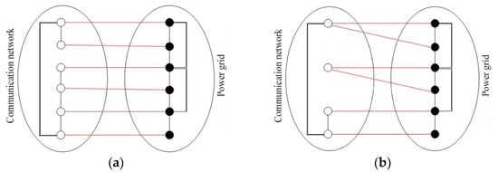 In the physical layer, the power plant and the transformer substation in the actual physical grid are abstracted as the topological node, whereas transmission lines are abstracted as power edges amongst nodes. This structure realizes the power flow transmission between generation nodes and load nodes. In the communication network structure, the information flow realizes the bidirectional transmission with the shortest route through information edges. Information nodes are also dispatching centers and communication plants and stations, whereas the information edges are communication links []. However, in different developing stages, upgrading or newly building the information nodes and links is limited by resource allocation. The scale of the communication network gradually increases after updating the corresponding power grids. Therefore, there is a scale difference between power grids and communication networks. The difference can be defined as the partial interdependency.