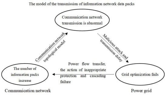 Then, the corresponding information cannot reach the dispatching center. The closed-loop control of the dispatching center will be invalid, and will cause the cascading failure. Packs will be lost and a pack delivering error will appear. The network might be attacked maliciously because of the packs’ abnormal delivering in the communication network, such as by the defense of service attack [] and false data attack []. The correct optimization and control information from the dispatching center cannot be sent to the corresponding nodes in time because of the transmission delay or loss, which leads to the failure of the power grid optimization. Eventually, this causes the vicious cycle of the cascading failures.