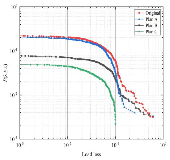 In Figure 8, it is clear that the power CPS of the original system and the systems of Plan A and Plan C enter the self-organized critical state. This means the power CPS is facing the risk of cascading failures and a big blackout under three such kinds of situations. Plan B has the smallest probability of a big blackout.