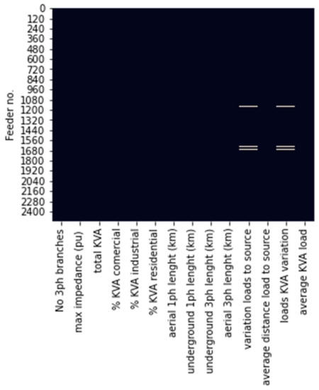 Before starting any analysis, a data checkup needs to be performed to make sure that there is no missing information. In our case, Figure 1 presents an analysis of missing features for all feeders, and missing features appear as white spaces on the figure. The figure indicates that 67 feeders have missing data for two features, the variance of the distance from the load to the source and the coefficient of variation of KVA consumed. Please notice that the distribution network planner provided the data and that the above-mentioned features were missed at the time.