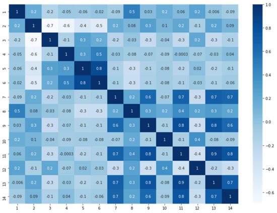 Figure 2 shows that features 5 and 6, 9 and 11, 9 and 13, 11 and 13, and 11 and 14 are highly correlated. Thus, we have decided to drop features 6, 11, and 13.