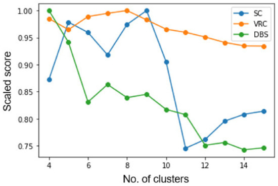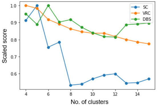 Both algorithms require us to provide the number of clusters to be created. As mentioned in Section 2.2, we use the silhouette score (SC), variance ratio criterion (VRC), and Davies–Bouldin score (DBS) to evaluate the best number of clusters. Figure 3 shows the scores when KM is applied to the 6-dimensional dataset. Figure 4 shows the scores when KM is applied to the 11-dimensional dataset. Figure 5 shows the scores when hierarchical clustering is applied to the 6-dimensional dataset. Figure 6 shows the scores when hierarchical clustering is applied to the 11-dimensional dataset.