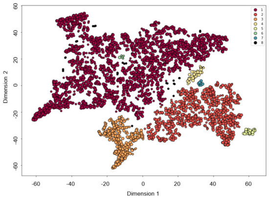 Using t-SNE to represent the high-dimensional data in a two dimensions plane allows utilization of the DBSCAN algorithm, which relies on a density-based notion of clusters and is designed to detect clusters of any shape [20].