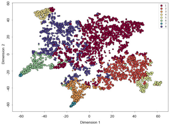 - Rousseuw, P.J. Silhouettes: A graphical aid to the interpretation and validation of cluster analysis. J. Comput. Appl. Math. 1987, 20, 53–65. [Google Scholar] [CrossRef]