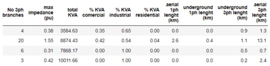 Table 3 shows the number of elements in each cluster and their classification as obtained with each of the algorithms used here. The classification of clusters is performed based on the easily spotted characteristics of elements forming a cluster. Industrial, residential, and commercial labels are given regarding the load composition. Urban and rural labels are given regarding the length of lines and cables composing the feeder; urban stands for short lines, and rural for long lines.