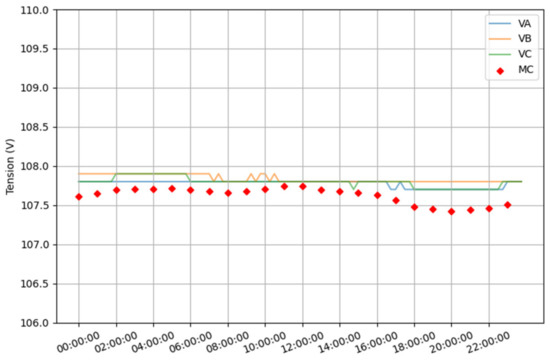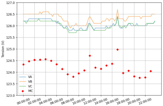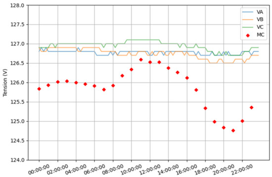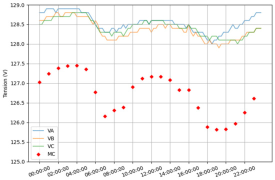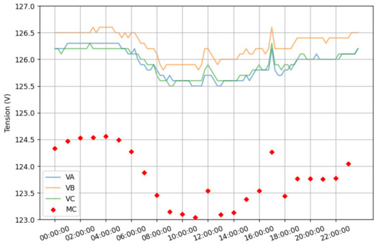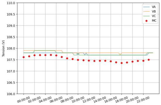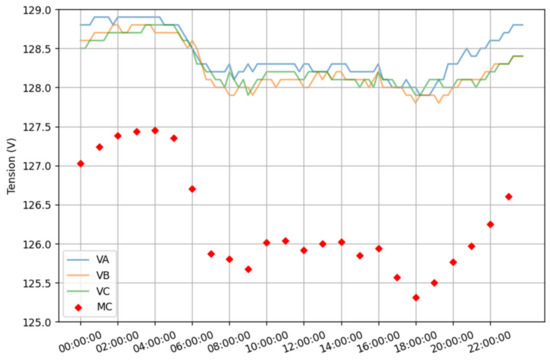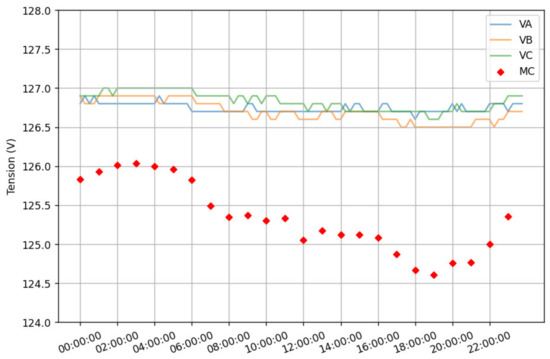 Feeder voltage and the average of all load voltages of feeder C.
