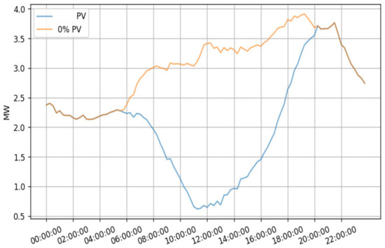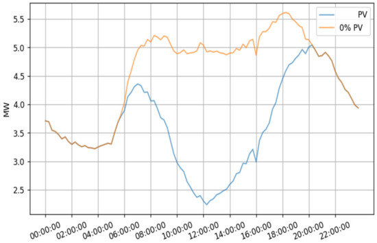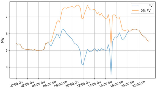 In the example, feeder and load voltages are measured before and after introducing 2.7 MW of PV production. The transformer’s tap changers are deactivated to observe the voltage’s natural behavior. Daily load and PV production profiles are for the summer period when feeders consume the least amount of power and PV installations have the largest production.