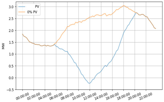 Figure 19, Figure 20, Figure 21 and Figure 22 compare the active power before and after introducing 2.7 MW of PV production in feeders A, B, C, and D, respectively. These figures show that PV production causes feeders A, B, and C to be at 0.8 MW, 2.4 MW, and 3.5 MW of power flow inversion. Whereas for feeder D, it will cause power flow inversion.