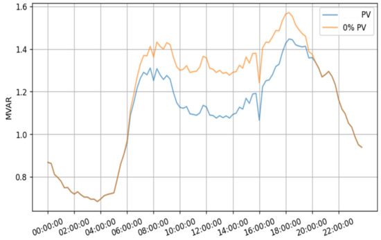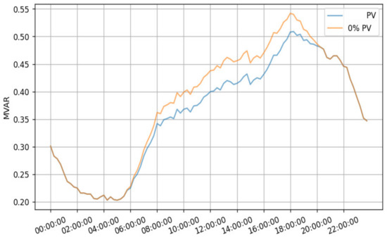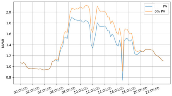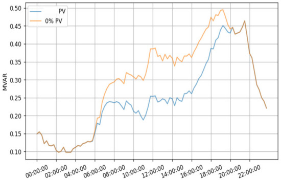 Figure 23, Figure 24, Figure 25 and Figure 26 compare the reactive power before and after introducing 2.7 MW of PV production in feeders A, B, C, and D, respectively. From these figures, it can be noticed that PV production causes a reduction of reactive power consumption of 0.15 MVAR, 0.15 MVAR, 0.12 MVAR, and 0.04 MVAR.