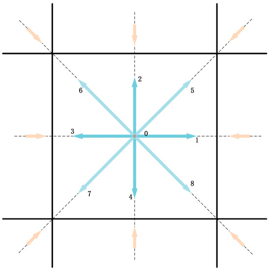where and are the particle distribution function and equilibrium distribution function related to the discrete velocity at respectively. is the relaxation time. is the viscosity. It is derived from the equation , where is the gas constant and is the gas temperature. In the development of LBM, the two-dimensional nine-velocity (D2Q9) lattice model has been widely and effectively applied in simulation experiments of two-dimensional flow. The velocity discretization of the D2Q9 lattice model at one lattice center is shown in Figure 1. For the D2Q9 model [41], the discrete velocity set is written as [42]: