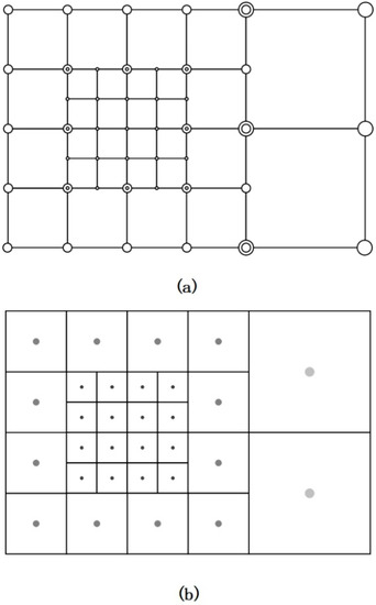 In this study, the pre-collision distribution function was reconstructed, and the cell-centered lattice structure shown in Figure 3b was selected. Since the center points of the grid are recorded, the positions of these center points will not be repeated. When the grid computing domain is divided into multiple parts for parallel computing, evaluating the distribution function at the center of the grid cell is a reliable solution because the control volume of the grid cell can be allocated to a single parallel computing domain. At the same time, the process of grid point refinement is actually to divide a grid into multiple grids. If the center point of the grid is used to represent a grid, the result of this kind of storage is similar to the fork-tree structure. The increase in the number of grid levels only needs to increase the depth of the fork tree, which is convenient for programming operations. Based on the above analysis, here the paper uses the volume-based approaches to store the multi-layer grid.