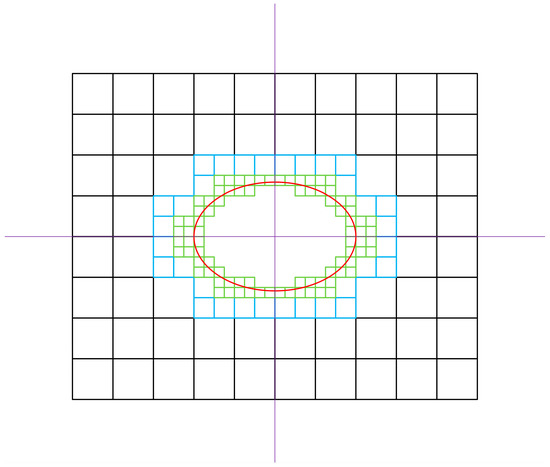 Example of a three-layer grid: the grid with a black frame is the first grid, the grid with a blue frame is the second grid and the grid with a green frame is the third grid. The red ellipse circle indicates the solid boundary in the flow field.